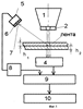 Одновременно с этим действием вторая камера 5, сканируя в пределах заданного ± , принимает через коллиматор 6 отклики отраженного рентгеновского потока и преобразует их в электрические сигналы. Электрический сигнал с камеры 5, пропорциональный длине гипотенузы OB (фиг.2), поступает в цифровой вычислитель 8, в котором определяется значение толщины h1 верхнего слоя ленты по выражению (1). Эта физическая величина в виде цифрового электрического сигнала подается в процессор 9, где осуществляются программные процедуры по определению значений суммы (h1+h2), h1 – верхнего слоя и h2 – нижнего слоя ленты.