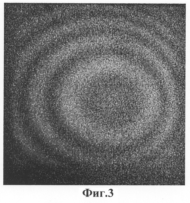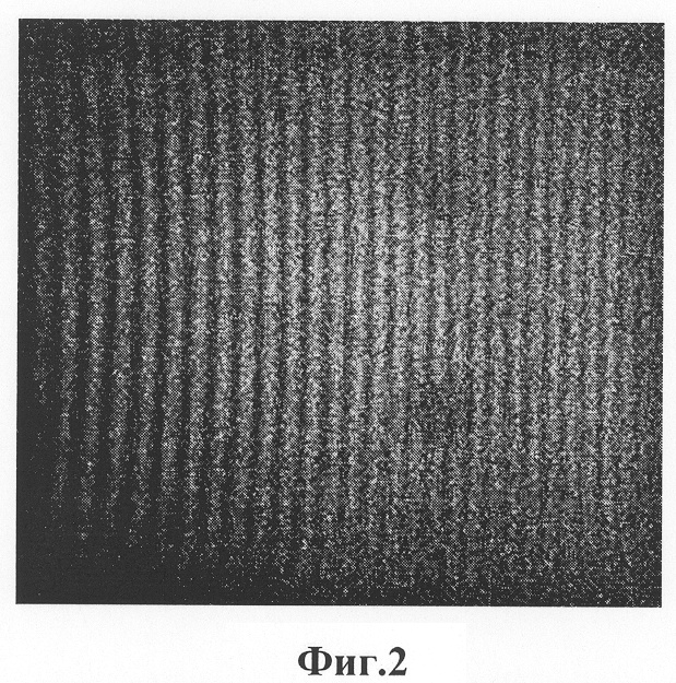 Для визуального подтверждения существования интерференционных полос при освещении голограммы неразведенным пучком со стороны объекта на фиг.2, 3, 4 приведены фотографии интерференционных картин, наблюдаемых в плоскости регистрации (Е) при различных смещениях объекта. В качестве объекта при записи голограмм использовался алюминиевый параллелепипед с диффузной поверхностью.