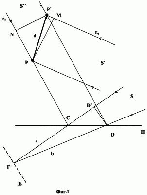 Сущность изобретения поясняется чертежами. На фиг.1 представлены элементы физической системы для реализации предлагаемого способа, где Р и Р’ – соответственные элементы поверхности объекта, смещение которых между экспозициями определяется вектором d; ro и rн – единичные векторы соответственно для направления распространения света, освещающего окрестность исследуемой точки поверхности (на стадии регистрации голограммы), и света, распространяющегося в направлении наблюдения (на стадии восстановления); S – опорный пучок, S’ – освещающий объект пучок; S” – восстанавливающий пучок; Н – голограмма, Е – плоскость регистрации.