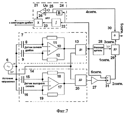На фиг.7 вывод источника переменного напряжения 6 соединен с объединенными выводами конденсаторов 8, 9, 15, 16. Эти выводы соответствуют ПМ1. Другие выводы конденсаторов 8, 9, которые соответствуют статорам гребенчатого двигателя, соединены с входами дифференциального усилителя 10, охваченного обратной связью с помощью резисторов 11, 12. Элементы 10-12 в совокупности образуют трансрезистивный усилитель. Выход усилителя 10 соединен с одним входом демодулятора 13, при этом другой вход демодулятора 13 соединен со вторым выводом источника переменного напряжения 6, при этом напряжения на первом и втором выводах источника переменного напряжения 6 сдвинуты на 90°. Элементы 8-13 образуют емкостной датчик 7, расположенный на оси первичных колебаний. Емкостной датчик 8, расположенный на оси вторичных колебаний, образован элементами 15-20, которые соединены аналогично одноименным элементам 8-13. Выход емкостного датчика 7 соединен с входом фазовращателя 28 и устройством возбуждения колебаний подвижной массы 21. Устройство возбуждения колебаний подвижной массы 21 включает в себя интегратор 22, умножитель 23, амплитудный детектор 24, источник опорного напряжения U0 25 и усилитель 26. Входы интегратора 22 и амплитудного детектора 24 соединены с выходом демодулятора 13. Выход усилителя 26 соединен с одним входом умножителя 23, а входы усилителя 25 соединены с источником 25 и выходом амплитудного детектора 24. Выход интегратора соединен с входом умножителя 23.