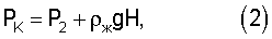 В этот момент поплавок 18 всплывает, укрепленный на нем магнит 16 сближается с герконовым реле 14, чем вызывает замыкание контактов последнего, и блок управления 13 переводит клапаны 7 и 8 в положение, когда резервуар 1 сообщен с магистралью 5 подвода газа и отсоединен от магистрали 6 сброса газа, а резервуар 2 – наоборот. Поступающий через трубопровод 9 газ вытесняет через трубку 20 жидкость из резервуара 1 в резервуар 2, а находящийся в резервуаре 2 газ вытесняется поступающей в него жидкостью через трубопровод 12 и клапан 8 в магистраль 6 сброса газа. При этом давление РК жидкости в месте сброса газа из трубопровода 9 (точка “К” на чертеже) складывается из давления Р2 газа в резервуаре 2 и гидростатического давления столба жидкости с высотой, равной высоте ее подъема в трубке 20: