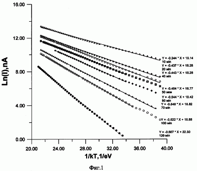 По результатам измерений построили график кривой зависимости тока от температуры в аррениусовских координатах (фиг.1).