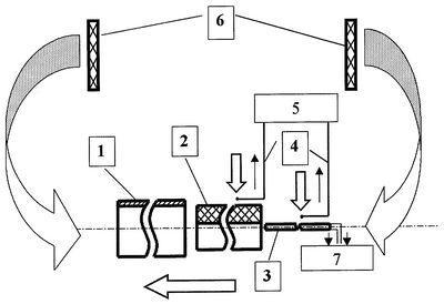 Установка содержит: 1 – медный футляр; 2 – цилиндрический образец; 3 – источник тепла; 4 – термопреобразователи хромель-алюмелевые; 5 – устройство регистрации развиваемой источником тепла мощности; 6 – шайбы; 7 – источник постоянного тока.