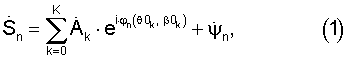 где k – номер радиосигнала при общем количестве К<3, – комплексная амплитуда радиосигнала при приеме его в центре решетки, 0k, 0k – пеленг и угол места прихода k-го радиосигнала, – шумы n-го приемного канала, включающие шум мирового фона, шумы антенны и радиоприемного устройства.