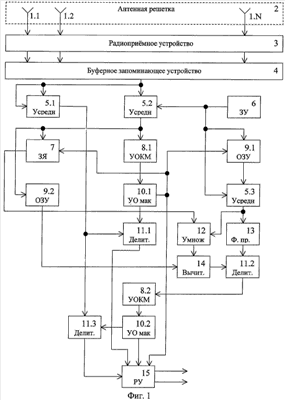 Антенны 1.1-1.N, образующие N-элементную антенную решетку 2, выходами подключены к входам радиоприемного устройства 3 и через его выходы – к входам буферного запоминающего устройства 4, выход которого соединен с первым и вторым входом усреднителя 5.1 и первым входом усреднителя 5.2, ко второму входу которого, а также усреднителя 5.3 и первому входу оперативного запоминающего устройства 9.1 подключен выход запоминающего устройства 6. Выход усреднителя 5.1 соединен с первым входом делителя 11.1 и первым входом делителя 11.3, выход которого подключен к первому входу решающего устройства 15. Выход усреднителя 5.2 соединен с входом оперативного запоминающего устройства 9.2, первым входом запоминающей ячейки 7 и входом устройства определения квадрата модуля 8.1, которое и устройство определения максимума 10.1 (через первый выход), делитель 11.1 (через второй вход) соединены последовательно. Второй выход устройства определения максимума 10.1 подключен ко второму (управляющему) входу запоминающей ячейки 7, второму входу оперативного запоминающего устройства 9.1 и второму входу решающего устройства 15, третий вход которого соединен с выходом делителя 11.1, а четвертый вход с вторым выходом устройства определения максимума 10.2, первый выход которого подключен ко второму входу делителя 11.3. Выход усреднителя 5.3 соединен с входом функционального преобразователя 13 и с первым входом умножителя 12, второй вход которого подключен к выходу запоминающей ячейки 7. Выход оперативного запоминающего устройства 9.2 соединен с первым входом вычитателя 14, второй вход которого подключен к выходу умножителя 12, а выход к первому входу делителя 11.2, второй вход которого соединен с выходом функционального преобразователя, а выход с входом устройства определения квадрата модуля 8.2, выход которого подключен к входу устройства определения максимума 10.2. Первый и второй выходы решающего устройства 15 являются выходами устройства, реализующего способ.