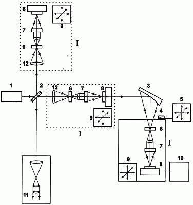 На чертеже изображено устройство фокусировки оптического излучения на объект, где: источник 1 лазерного излучения, светоделительная пластина 2, фокусирующий объектив 3, держатель 4 для объекта с манипулятором 5, обозначенный римской цифрой I узел регистрации сечений фокального объема, состоящий из миры 6, микрообъектива 7, фотоприемника 8, манипулятор 9 узла регистрации сечений фокального объема, встроенный в компьютер блок 10 обработки сигнала с фотоприемника, устройство 11 контроля фокусировки – зрительная труба. Пунктиром выделены варианты установки узла регистрации сечений фокального объема со вторым объективом 12 (см. п.3 Формулы).