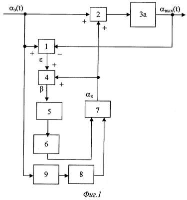 Следящая система с люфтом (фиг.1) содержит измеритель рассогласования 1 задающего и выходного сигналов, суммирующий вход которого соединен с суммирующим входом первого сумматора 2, последовательно соединенного с нелинейным звеном типа «люфт» и объектом управления За с датчиком выходного сигнала, выход которого соединен с вычитающим входом измерителя рассогласования 1, второй сумматор 4, первый суммирующий вход которого соединен с выходом измерителя рассогласования 1, а второй – со вторым суммирующим входом первого сумматора 2, блок вычисления модуля 5, вход которого соединен с выходом второго сумматора 4, блок запаздывания 6, вход которого соединен с выходом блока вычисления модуля 5, блок умножения сигналов 7, первый вход которого соединен с выходом блока запаздывания 6, а выход – со вторым суммирующим входом первого сумматора 2 и вторым суммирующим входом второго сумматора 4, блок определения знака сигнала 8, выход которого соединен со вторым входом блока умножения сигналов 7, блок дифференцирования 9, вход которого соединен с суммирующим входом измерителя рассогласования 1, а выход – со входом блока определения знака сигнала 8.