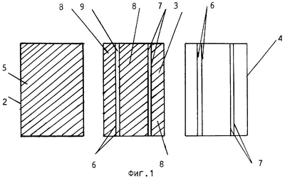 Второй элемент 3 напрессовывают плоскостью без полос нитрокраски на клеевой слой 5 поливинилхлоридного элемента 2, на свободную плоскость второго элемента 3 по направлению просвечивающих полос нитрокраски 6, 7 наносят клеевой слой 8, оставляя свободные зоны 9.