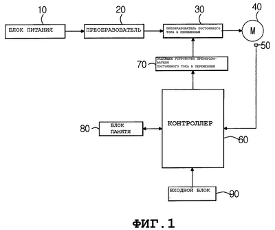 Как показано на фиг.1, устройство для управления двигателем стиральной машины, в соответствии с настоящим изобретением, включает преобразователь 30 постоянного тока в переменный для подачи мощности привода в двигатель 40. Преобразователь 30 постоянного тока в переменный соединен с блоком 10 питания через преобразователь 20 и подключен к контроллеру 60 через задающее устройство 70 преобразователя постоянного тока в переменный. Преобразователь 20 преобразует энергию переменного тока, поступающую из блока 10 питания, в постоянный ток, и подает энергию постоянного тока в преобразователь 30 постоянного тока в переменный. Преобразователь 30 постоянного тока в переменный, который включает переключающий элемент, преобразует энергию постоянного тока, получаемую из преобразователя 20, в энергию переменного тока и передает энергию переменного тока в двигатель 40, в результате чего двигатель 40 вращается с требуемой скоростью.