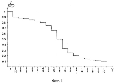 Первый режим работы инвертора с =1 является режимом без регулирования, когда во все полупериоды колебаний тока нагрузки происходит подача энергии от источника. В остальные 18 режимов работы инвертора осуществляется регулирование выходного тока инвертора от 90 до 10% от номинального значения тока инвертора без регулирования при постоянной номинальной нагрузке. Представленная зависимость (фиг.1) является регулировочной характеристикой резонансного инвертора со встречно-параллельными диодами по заявленному способу управления.