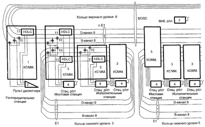 Положительный результат от использования предложенного технического решения состоит в том, что повышается надежность радиосвязи за счет обеспечения переговоров по обходным ветвям колец при обрыве основных ветвей. Скорость передачи информации в кольцах нижнего и верхнего уровней при этом не уменьшается.