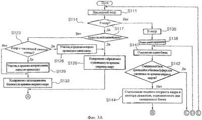На фиг.3А и 3В показаны блок-схемы, иллюстрирующие способ кодирования последовательности движущихся изображений в системе кодирования движущихся изображений в соответствии с предпочтительным примером осуществления настоящего изобретения. Как видно на фиг.3А и 3В, кадры один за другим вводят из последовательности движущихся изображений (S111).