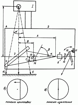 В центраторе имеется цилиндрическая линза 12, которая установлена на оптической оси лазерного пучка между торцом лазера и отражателем 5 таким образом, что на объекте 6 образуется вертикальная светящаяся полоса. Светоделитель 13 и жестко связанный с ним третий отражатель 14 установлены на оси, перпендикулярной оси лазера, на расстоянии С друг от друга, при этом центр светоделителя, т.е. точка пересечения его отражающей поверхности с осью лазера, расположен на расстоянии В от точки пересечения оси рентгеновского пучка с отражающей поверхностью первого отражателя 4. Отражающая поверхность светоделителя наклонена к оси лазера на 45°, а отражающая поверхность третьего отражателя наклонена к оси лазера под углом 45°+ /4.