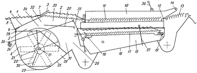 Дополнительно начало нижнего решета 17 смещено за счет удлинения нижнего решета в сторону скатного воздухопроницаемого листа 20 относительно начала верхнего решета 11 на величину большую одной десятой D. Экспериментально установлено, что при сравнении схем очистки, отличающихся при неизменном положении заднего конца нижнего решета только величиной смещения начала нижнего решета 17 относительно начала верхнего 11 соответственно на 0,27D и на 0,15D, имеет место различный характер изменения зависимости потерь зерна от подачи примесей на очистку. Обе зависимости линейные, но для первой схемы указанная зависимость восходящая, для второй – падающая, то есть неустойчивая. Сорные примеси в бункере для обеих схем не связаны со значением подачи примесей на очистку, но среднее значение для неустойчивой зависимости заметно больше (1,09% против 0,66%). Устойчивый характер зависимости технологических показателей от подачи примесей на очистку имеет место, начиная с 0,17D. Оптимальные результаты достигаются при смещении начала нижнего решета и соответственно удлинении всего решета на 0,27D, то есть на пять рядов гребенок. Однако с учетом ошибки опыта оптимальное значение следует расширить в обе стороны на один ряд гребенок, что соответствует диапазону (0,22÷0,34)D. Следовательно, использование схемы со смещенным началом нижнего решета 17 относительно начала верхнего решета 11 в сторону скатного воздухопроницаемого листа 20, то есть с удлиненным по меньшей мере на три ряда гребенок нижним решетом создает запас работоспособности на полях с повышенной засоренностью сорняками, а также при высоких значениях соломистости убираемого поля, причем указанное смещение должно быть не менее 0,1D, предпочтительно в диапазоне (0,22÷0,34)D.