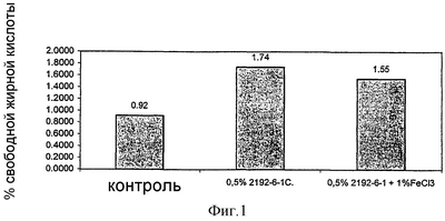 На фиг.1 показано действие добавления в образец теста продукта твердофазного глицеролиза (2192-6-1С) как с ингибитором липазы, так и без указанного ингибитора. Полученный результат измерен в промилле (о/оо) свободных жирных кислот, остающихся в тесте. Ссылка на фиг.1 может быть найдена в приводимых ниже примерах.
