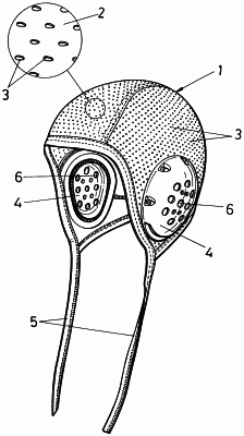 Кроме того, в двух боковых областях шапочки (1) предусмотрены проемы, в которых выполнены средства (4) защиты органов слуха, выполненные из твердого пластика и снабженные перфорационными отверстиями (6).