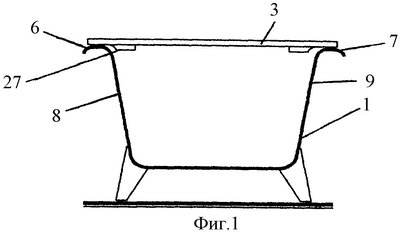 Несущая часть 3 имеет такие габаритные размеры, которые позволяют устанавливать ее своими противолежащими периферийными частями 4 и 5 на верхние края 6 и 7 противоположных боковых стенок 8 и 9 ванны 1.