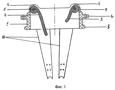 От нижней части корпуса протеза отходят две пластины 10, замещающие функцию подклапанных хорд. Они могут быть обшиты тканью, а длина их соответствует длине замещаемых хорд.