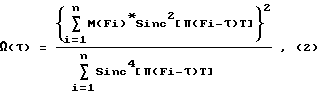Узел определения зоны сканирования 12, реализуемый в данном случае как узел выбора двух максимумов, выбирает два частотных канала с максимальным значением M(Fi) и определяет их номера, которые передаются в узел 13, где определяются их частоты: F1 и F2. Затем в узле 13 производится генерирование отсчетов регрессионной функции вида (Sin(x)/(x))2, где x = (Fi- )T, при этом переменная изменяется в диапазоне от F1 до F2 с дискретностью, заданной управляющим сигналом 4 из блока управления 11.