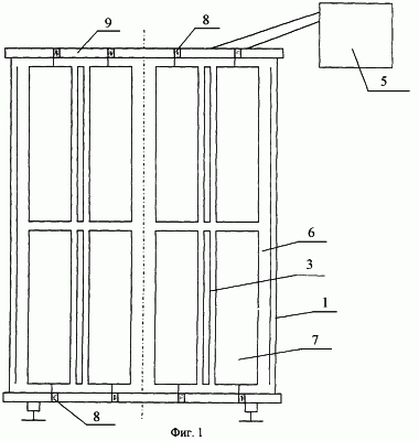 Известное устройство работает следующим образом. Раздвижная конструкция корпуса обеспечивает прохождение пациента внутрь камеры для принятия процедуры. После того как пациент займет место на подставке, одновременно включается питание ламп и двигатель приводит в движение экраны.