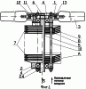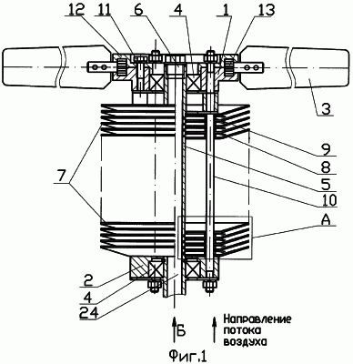 Верхняя втулка 1 соединена с фланцем 12 винтами 11; между втулкой 1 и фланцем 12 зажаты зубчатые втулки 13 лопастей крыльчатки 3, позволяющие устанавливать лопасти под необходимым углом.