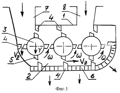 Крупные куски шин загружаются (фиг.1 и фиг.2) в загрузочный узел 7 и попадают на ротор 3, который вращается с наименьшей скоростью вращения . Ротор 3, расположенный под загрузочным узлом 7, производит первичное грубое измельчение шин о неподвижные ножи 4, размещенные на корпусе 1 и о подвижные ножи 5 следующего контактируемого с ним другого ротора, который вращается с большей скоростью вращения . Измельчаемый материал шин ротором 3, расположенным под загрузочным узлом 7 подается внутрь рабочей камеры 2, откуда следующим вращающимся ротором передается на следующую стадию измельчения о неподвижные резцы 4, расположенные на решетке 6.