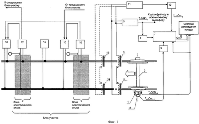 Установленная на бесстыковых участках пути система автоблокировки осуществляет контроль за занятостью блок-участка поездом и в соответствии с этим управляет огнями путевых светофоров и кодовыми путевыми трансмиттерами системы АЛСН (на фиг.1 – трансмиттеры 10 и 18). Контроль за занятостью блок-участка осуществляется с помощью путевых приемников, установленных на границах смежных блок-участков (на фиг.1 – приемники 16 и 17); эти приемники принимают поступающие в общую рельсовую цепь сигналы путевых генераторов системы автоблокировки, расположенных в средней части каждого блок-участка (на фиг.1 – путевой генератор 15). Вступивший на блок-участок поезд передней колесной парой замыкает левую и правую рельсовые нити и образует таким образом общую рельсовую цепь (контур) для протекания сигнальных токов КПТ и путевых генераторов. По мере приближения поезда к границе блок-участка и соответственно к точкам подключения путевого приемника к рельсовой цепи (на фиг.1 – путевой приемник 6) сигнал, поступающий на вход путевого приемника от впереди расположенного путевого генератора (на фиг.1 – путевой генератор 15), ослабляется за счет шунтирования входной цепи путевого приемника приближающимся поездом. Поскольку электрические характеристики рельсовой цепи зависят от разнообразных факторов (состав и качество балласта пути, его температура и увлажненность, степень загрязненности и т.п.), а порог срабатывания путевого приемника имеет примерно постоянную величину, то приближающийся поезд может вызвать срабатывание путевого приемника на разных удаленностях от точек подключения путевого приемника к рельсовой цепи; это обуславливает возникновение зоны существования электрического стыка между смежными блок-участками (известен также как “эффект плавающего стыка”). Система автоблокировки построена таким образом, что при приближении поезда к границе блок-участка срабатывание путевого приемника 16 приводит к отключению установленного рядом с ним КПТ (на фиг.1 – КПТ 10) и включению КПТ на границе впереди расположенного блок-участка (на фиг.1 – КПТ 18). Поскольку устройство корректировки линейной координаты нахождения поезда при определении границ смежных блок-участков на бесстыковом пути ориентируется только на момент изменения периода принимаемого кодового сигнала АЛСН (момент смены типа КПТ), то на бесстыковых участках пути ошибка определения линейной ординаты границы блок-участков будет складываться из собственной ошибки устройства корректировки линейной координаты и из общей протяженности зоны электрического стыка, т.е. станет недопустимо большой.