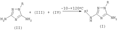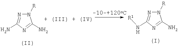 Способ получения 5-амино-3-N-R1-амино-1-R-1,2,4-триазолов общей формулы I где R означает фенил, бензил, 4-фенилтиазол-2-ил или 4-метил-5-карбэтокситиазол-2-ил радикал; R1 означает ацетил, трифторацетил, сукциноил, бензоил, метилбензоил или толуолсульфонил радикал, заключающийся в том, что к смеси 3,5-диамино-1-R-1,2,4-триазола общей формулы II где R имеет указанные выше значения, апротонного растворителя, такого, как ацетонитрил или диметилформамид, и органического основания (III), которое представляет собой триэтиламин или пиридин, прибавляют ацилирующий агент общей формулы IV где R1 имеет указанные выше значения, а Х означает Cl или группу OR1, где R1 имеет указанные выше значения, и взаимодействие осуществляют при температуре -10 – +120°С и перемешивании при мольном соотношении II:III:IV=1,00:1,15-1,40:1,05-1,35.