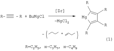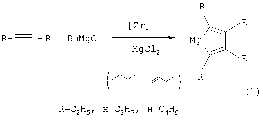 Способ получения 2,3,4,5-тетраалкилмагнезациклопента-2,4-диенов общей формулы (I) где R – C2H5, н-C3H7, н-C4H9, характеризующийся тем, что дизамещенный ацетилен общей формулы R- где R – С2Н5, н-С3Н7, н-С4Н9, взаимодействует с н-BuMgCl в присутствии катализатора цирконацендихлорида (Cp2ZrCl2) в мольном соотношении R-