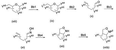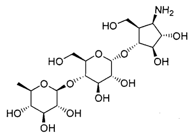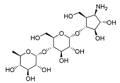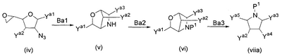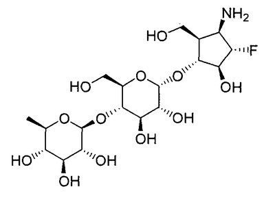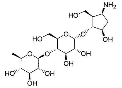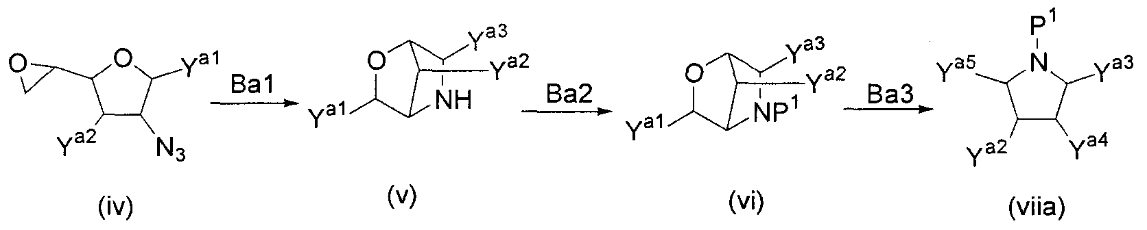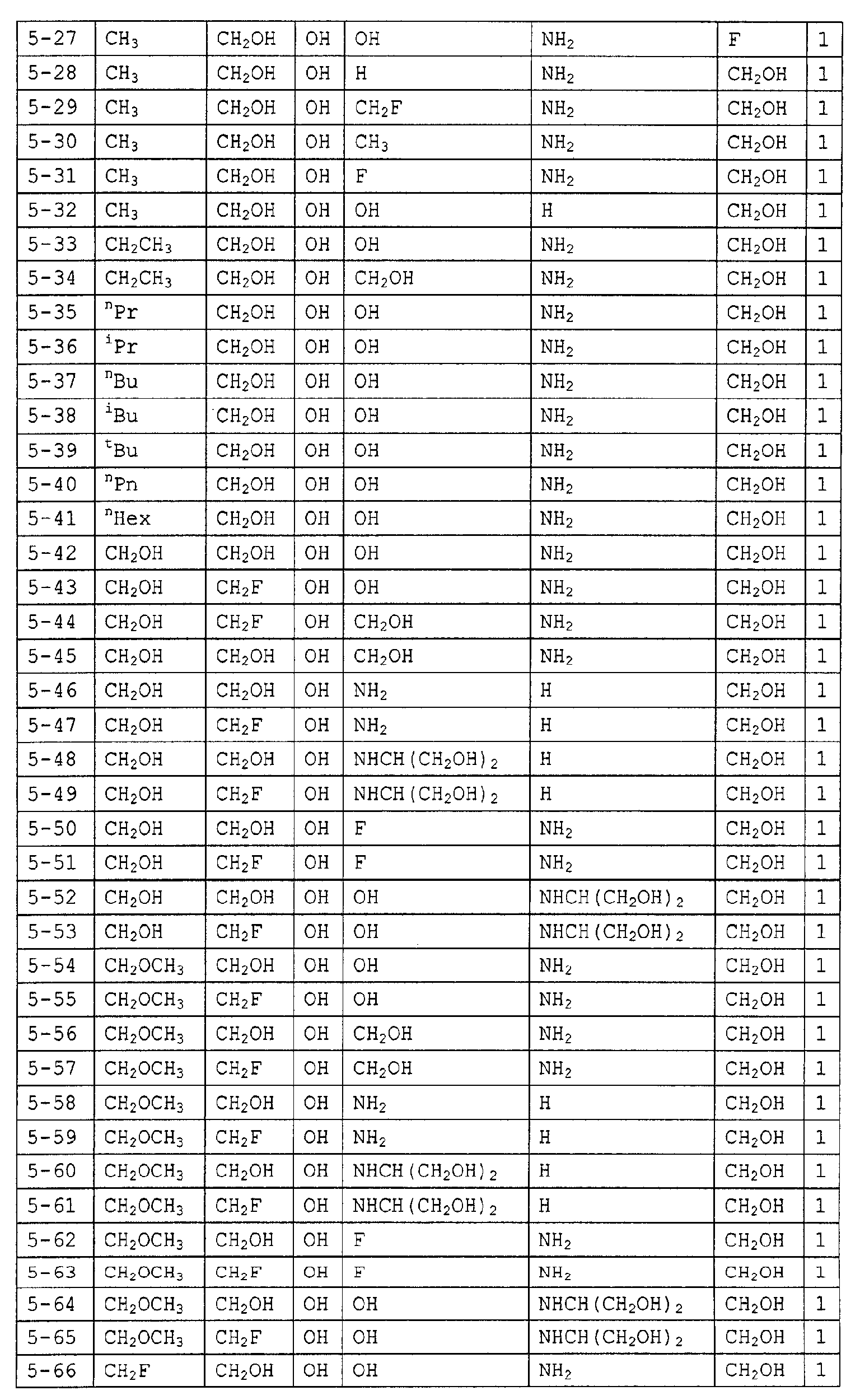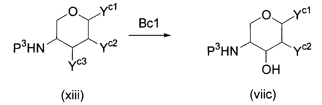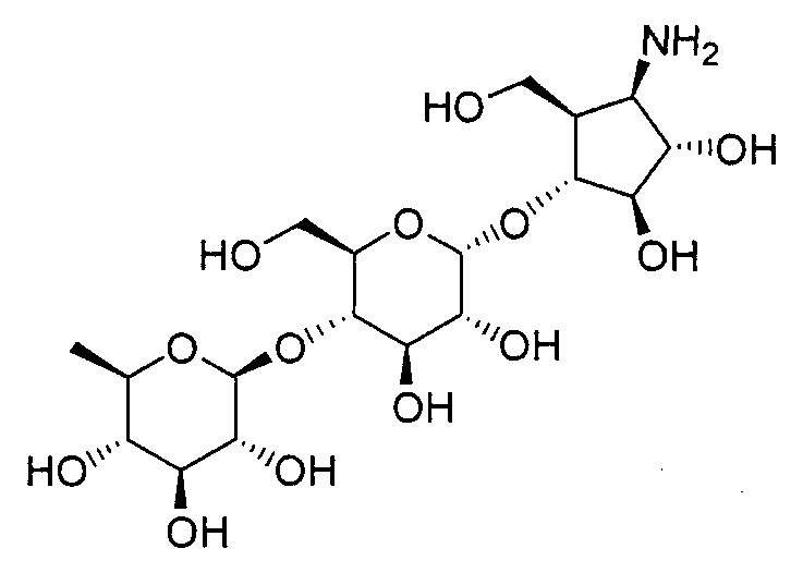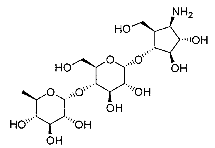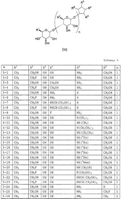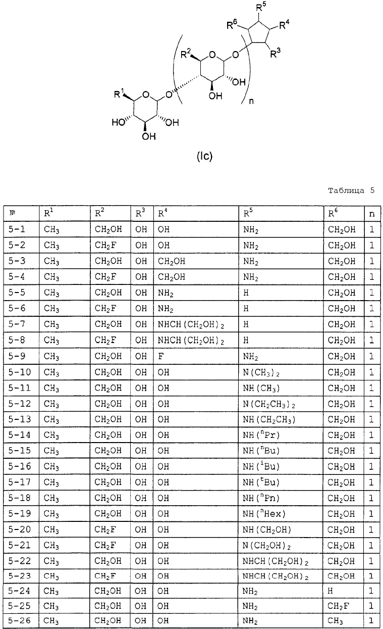 1H ЯМР (400 МГц, D2O): МС (FAB) m/z: 464 (M+Na)+, 442 (M+H)+. Пример 14 (1R,2S,3R,4R,5R)-1-Амино-2,3-дигидрокси-5-гидроксиметилциклопент-4-ил-4-O-(6-дезокси- (14a) Метил-4-O-бензоил-2,3-ди-O-бензил-6-O-п-толуолсульфонил- Метил-2,3-ди-O-бензил-6-O-п-толуолсульфонил- 1H ЯМР (400 МГц, CDCl3): МС (FAB) m/z: 633 (M+H)+. (14b) Метил-4-O-бензоил-2,3-ди-O-бензил-6-дезокси-6-иод- Соединение (196 г, 310 ммоль), синтезированное в примере 14 (14a), растворяли в толуоле (2л) и в атмосфере азота добавляли иодид натрия (235 г, 1,57 моль) и 18-краун-6-эфир (16,6 г, 62,8 ммоль) с последующим перемешиванием смеси при 100°C в течение 2 часов. Реакционную смесь охлаждали до комнатной температуры и фильтровали, отфильтрованный продукт промывали толуолом. Фильтрат и промывочную жидкость промывали насыщенным водным гидрокарбонатом натрия (1 л) и насыщенным раствором соли (1 л) и сушили над безводным сульфатом натрия с последующей отгонкой растворителя при пониженном давлении с получением указанного в заголовке желаемого соединения (181 г, выход 99%) в виде бесцветного твердого вещества. 1H ЯМР (400 МГц, CDCl3): МС (FAB) m/z: 589 (M+H)+. (14c) Оксим 4-O-бензоил-2,3-ди-O-бензил-5,6-дидезокси-D-ксилогекс-5-енозы Соединение (181 г, 307 ммоль), синтезированное в примере 14 (14b), растворяли в изопропаноле (1,5 л) и дистиллированной воде (50 мл) и добавляли цинковую пыль (180 г), промытую разбавленной хлористоводородной кислотой, с последующим перемешиванием смеси при 100°C в течение 1 часа. Реакционную смесь фильтровали через целит, отфильтрованный продукт промывали этанолом и фильтрат, и промывочную жидкость отгоняли при пониженном давлении. Остаток растворяли в этаноле (500 мл) и добавляли гидроксиламингидрохлорид (42,7 г, 615 ммоль) и пиридин (49,7 мл, 615 ммоль) с последующим перемешиванием смеси при 80°C в течение 40 минут. Растворитель отгоняли при пониженном давлении, остаток очищали колоночной флэш-хроматографией на силикагеле (гексан:этилацетат, 5:1, об./об.) с получением указанного в заголовке желаемого соединения (126 г, выход 92%) в виде бесцветного твердого вещества. 1H ЯМР (400 МГц, CDCl3): МС (FAB) m/z: 446 (M+H)+. (14d) (3aR,4R,5R,6S,6aR)-4-бензилокси-5,6-дибензилоксигексагидроциклопента[c]изоксазол Соединение (126 г, 282 ммоль), синтезированное в примере 14 (14c), растворяли в толуоле (800 мл) и смесь перемешивали при 120°C в течение 8 часов. Растворитель отгоняли при пониженном давлении и остаток очищали колоночной флэш-хроматографией на силикагеле (гексан:этилацетат, 3:1, об./об.) с получением указанного в заголовке желаемого соединения (59,7 г, выход 48%) в виде бесцветного твердого вещества. 1H ЯМР (400 МГц, CDCl3): МС (FAB) m/z: 446 (M+H)+. (14e) (3aR,4R,5S,6S,6aR)-1-Бензилоксикарбонил-5,6-дибензилокси-4-гидроксигексагидроциклопента[c]изоксазол Соединение (59,7 г, 134 ммоль), синтезированное в примере 14 (14d), растворяли в метаноле (1 л) и добавляли метоксид натрия (10 мл, 49 ммоль) с последующим перемешиванием смеси при комнатной температуре в течение 15 минут. После добавления к реакционной смеси при 0°C насыщенного водного раствора хлорида аммония (500 мл) смесь экстрагировали этилацетатом (1,5 л) и органический слой промывали насыщенным раствором соли (50 мл). К органическому слою при 0°C добавляли насыщенный водный гидрокарбонат натрия (500 мл) и бензилоксихлорформиат (22,9 мл, 160 ммоль) и смесь перемешивали при 0°C в течение 1 часа. После промывания органического слоя насыщенным раствором соли (500 мл) сушили над безводным сульфатом натрия и растворитель отгоняли при пониженном давлении. Остато