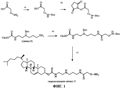 Синтез неогликолипидов: Каждый представитель исследуемого семейства неогликолипидов состоит из несущего холестерин липида и молекулы олигосахарида, связанных друг с другом с помощью линкера. Весь процесс синтеза разделяли на 2 части; сначала осуществляли синтез липида, содержащего линкер, а затем осуществляли хемоселективное сочетание этого липида с выбранными молекулами сахара. Решающую роль в этой стратегии имеет образование гидроксиламина (фиг.1).