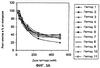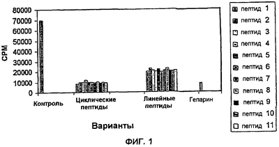 Пример 1: Влияние пептидов на фосфорилирующий участок CKII: Данный анализ основан на in vitro реакции фосфорилирования с использованием субстратной последовательности RRREEETEEE, которая представляет собой оптимизированный консенсусный домен CKII-фосфорилирования. Данную реакцию осуществляют в 50 мкл 25 мМ рН 7,5 Трис:HCl, 1 мкКи 32Р- АТФ, 100 мкМ АТФ, 2 мг/мл субстратного пептида, 0,2 М NaCl, 10 мМ MgCl и 1 единицы фермента CKII (Promega). Реакцию инкубируют при 37°С в течение 10 минут. Затем на хроматографическую бумагу PE-81 (Whatmann) наносят 5 мкл реакционной смеси в виде пятна и осуществляют четыре промывки с помощью 10 мМ H3PO4. В заключение измеряют связанную с фильтрами радиоактивность и по уровням cpm определяют ферментативную активность CKII в каждом образце. Одновременно в каждый анализ в качестве внутреннего контроля включают специфический ингибитор CKII, подобный гепарину. Представленные на Фиг. 1 данные показывают, что циклические пептиды ингибируют CKII-фосфорилирование на 80%. Линейные пептиды также ингибируют CKII-фосфорилирование области 28-38 в Е7, хотя и в меньшей мере по сравнению с циклической формой. Эти данные указывают, что описанные здесь пептиды ингибируют фосфорилирующий участок CKII и дают основание полагать, что их структура играет существенную роль в их взаимодействии с последовательностями-мишенями.