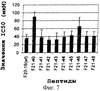 Фиг. 7. Структурно-функциональный анализ гомологичных вариантов пептида CWMSPRHLGTC (SEQ. ID. No.5). Клетки линии Н-125 рака легких человека в концентрации 2×104 клеток/мл высевали в 96-луночные планшеты. Каждый пептид, полученный в результате «аланинового сканирования» пептида дикого типа, искусственно сливали с проникающим в клетки пептидом Tat-1. Концентрация различных химерных пептидов варьировала от 0 до 200 мкМ. Антипролиферативный эффект в каждом случае выражали в виде значения IC50.
