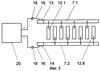 В результате электрическая схема подачи электрического напряжения на присадку принимает вид, показанный на фиг.3. Здесь кольцевые токосъемники 7.1, 7.2 корпуса 2 со стержнями 12.1-12.8 и токосъемники 13 и 14 валов 3.1 и 3.2 показаны в развернутом виде. На фиг.3 также показано, что стержни 12.1, 12.3, 12.5 и 12.7 подключены к токосъемнику 7.1, а расположенные между ними стержни 12.2, 12.4, 12,6 и 12.8 – к токосъемнику 7.2 (п.4 формулы).