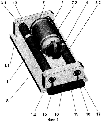 На фиг.1 показано, что в рабочем положении токосъемники 7.1 и 7.2 корпуса 2 раздельно соединены с кольцевыми токосъемниками 13 и 14 валов 3.1 и 3.2, к осям которых, электрически изолированным от опор 1.1 и 1.2, подключены скользящие контакты 15, 16, установленные на изоляционной площадке 17 и также изолированные от опор 1.1 и 1.2. Клеммы 18 и 19 предназначены для подключения источника электрического напряжения 20.