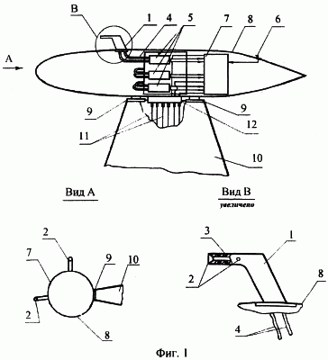 Система измерения воздушных параметров полета состоит из ПВД 1 с приемными отверстиями 2, снабженных электронагревательной противообледенительной системой 3, соединенных пневмотрассами 4 с датчиками давления 5, датчиков температуры 6 наружного воздуха и вычислителя 7. Все перечисленные агрегаты размещены в едином специальном аэродинамически обтекаемом корпусе 8, крепящемся с помощью узлов подвески 9 к элементу 10 ЛА. Сама система является автономной и сообщается с ЛА и его системами только каналами передачи информации и подвода электроэнергии 11 через разъемы 12.
