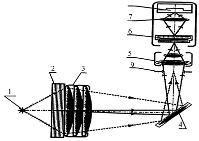 При облучении экрана-преобразователя 2 пучком ионизирующего излучения происходит преобразование этого излучения в световое излучение. Каждый луч излучения, прошедший через образец, создает в экране-преобразователе 2 за время экспозиции прямолинейный трек, точки которого излучают сферически изотропный световой поток. При этом геометрические продолжения всех световых треков сходятся в точку, совпадающую с положением источника нейтронов 1. Для экрана-преобразователя 2 конечной толщины проекционная оптика в отсутствии конденсора 3 изображает трек в форме штриха, длина которого пропорциональна, с одной стороны, тангенсу внеосевого угла, под которым трек виден из центра объектива, а с другой стороны, толщине экрана-преобразователя 2, что приводит к потере пространственного разрешения в периферийных зонах приемника. Чтобы этого не происходило в описываемом приемнике после экрана-преобразователя 2 и установлен линзовый конденсор 3. Его назначение – построить в центре входной апертуры (зрачка) входного объектива 5 изображение точки, в которой пересекаются экранные треки. Входная апертура при этом играет роль диафрагмы 9, препятствуя прохождению световых лучей, распространяющихся в направлениях, не проходящих через источник быстрых нейтронов 1.