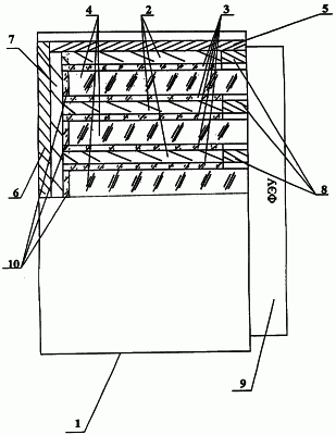 Для защиты от фона чувствительный элемент детектора окружен висмутом. На чертеже приведена схема предлагаемого активационного детектора нейтронов, где: 1 – светозащитный корпус, 2 – полые цилиндры бериллиевого преобразователя, 3 – полые цилиндры органического сцинтиллятора, 4 – цилиндрические световоды, 5 – полый цилиндр из висмута, 6 – диск из висмута, 7 – бериллиевый преобразователь в виде диска, 8 – кольца из висмута, 9 – фотоэлектронный умножитель, 10 – сцинтилляторы в форме колец.