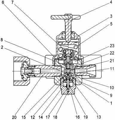 Газовый редуктор содержит корпус 1 с седлом 2 и крышкой 3, смонтированные в корпусе настроечную часть, включающую настроечный винт 4, пружину 5, мембрану 6 с опорной тарелью 7, с которой жестко связан толкатель 8, и редуцирующий клапан, включающий полый корпус 9 с уплотнением 10 сферообразной формы, снабженным двухступенчатым расходным каналом 11, в ступени большего диаметра которого размещен конец толкателя 8, и кольцевым элементом 12 из упругого материала, например фторопласта, размещенным в ответной канавке 13 на наружной поверхности полого корпуса 9, который установлен в уравновешивающей камере 14 с кольцевым зазором относительно ее стенки, предназначенным для пневматической связи камеры с полостью 15 высокого давления корпуса 1. Камера 14 может быть выполнена в жестко и герметично связанной с корпусом 1 заглушке 16, как это показано на чертеже, и имеет управляющий клапан 17, один конец которого установлен в ступени меньшего диаметра расходного канала 11 напротив толкателя 8, а другой конец установлен в посадочном отверстии 18 заглушки, при этом оба клапана под воздействием пружины 19 редуцирующего клапана подпружинены в направлении седла 2 и толкателя 8. В исходном состоянии, показанном на чертеже, винт 4 вывернут, пружина 5 не нагружена, пружина 19 поджимает редуцирующий клапан уплотнением 10 к седлу 2, а управляющий клапан 17 – на перекрытие расходного канала 11 в уплотнении 10. При подаче газа по входному штуцеру 20 он поступит в полость 15 высокого давления и связанную с ней уравновешивающую камеру 14 до выравнивания с давлением в баллоне. Проход газа в полость 21 рабочего давления исключен.