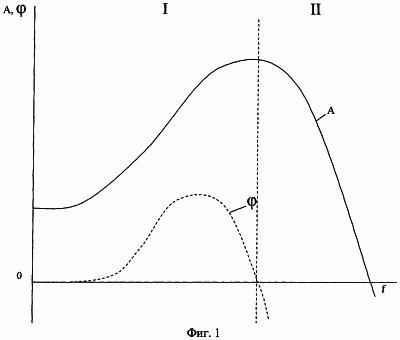На фиг.1 представлены амплитудно-частотная (А) и фазочастотная ( ) характеристики канала управления электромагнитным подшипником. Формирование токов, необходимых для стабилизации ротора в пространстве, осуществляют в двух частотных областях (f). Первая (низкочастотная) область охватывает зону I, перекрывающую частоты основных колебаний ротора и корпуса машины, определяемые массой и экваториальным моментом ротора и жесткостью каналов электромагнитного подшипника (как правило, ширина этого диапазона не превышает сотен герц). Формирование токов на этом участке реализуют цифровой частью контроллера и описывают передаточной функцией: