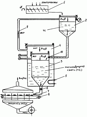 По мере опорожнения емкости 3 в ней происходит снижение давления. Однако в емкости 4 сохраняется избыточное давление ризб. По трубопроводу 9 пар под избыточным давлением поступает в емкость 2. Под действием этого давления тестообразную смесь подают в емкость 3 и постепенно заполняют ее. При этом давление в емкости 4 снижается за счет охлаждения воды посредством охлаждения стенок емкости 3 вновь поступающей порцией тестообразной смеси из емкости 2.