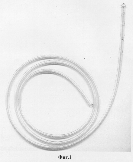 Известно устройство для активного дренирования ран однократного применения с баллоном вместимостью до 500 см3 (ТУ 64-2-114-82), состоящее из однопросветной поливинилхлоридной трубки, имеющей два конца: один конец трубки «рабочий» с отверстиями находится в дренируемой полости, другой – свободный (фиг.1).
