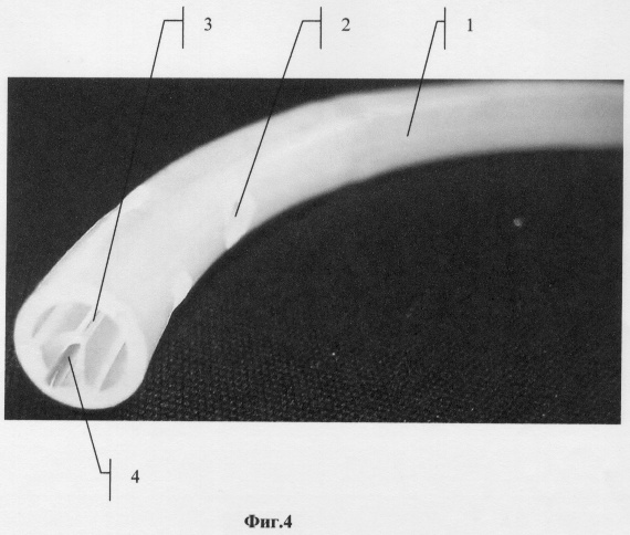 На фиг.3 приведен общий вид НДДТ, на фиг.4 – вид «рабочего» конца НДДТ с иссеченной мембраной между капилляром и основным просветом.