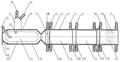 Корпуса генератора 4, камер 5, 6, 7 имеют одинаковый диаметр и образуют сборный корпус реактора.