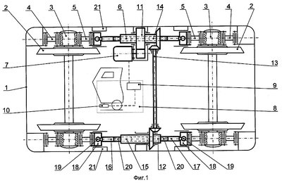 Каждый распорный механизм 11 (12) расположен вдоль боковой стороны рамы тележки 1 и включает кривошип 14 (15), два продольных стержня 16, 17 и два идентичных ползуна 18. Кривошипы 14 и 15 распорных механизмов 11 и 12 соединены между собой синхронизирующим звеном 13, которое представляет собой любую известную механическую передачу синхронного вращения между параллельными валами, например цепную, зубчатую, реечную или шарнирно-рычажную. Каждый продольный стержень 16 (17) соединен с ползуном 18 первой одноподвижной кинематической парой 19, а с кривошипом 14 (15) – второй одноподвижной кинематической парой 20. Ползуны 18 каждого распорного механизма 11 (12) установлены в общей продольной направляющей 21 рамы тележки 1 и имеют противоположно направленные перемещения. Такое выполнение каждого распорного механизма 11 (12) делает его оппозитным.