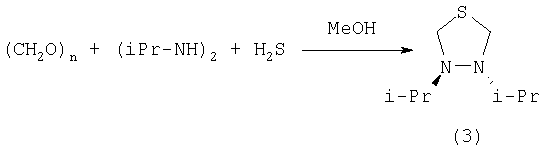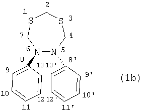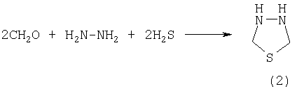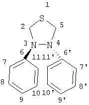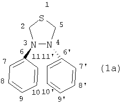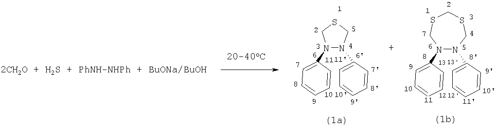 Предлагаемое изобретение относится к способам получения новых органических соединений, в частности к способу получения 3,4-дифенил-1,3,4-тиадиазолидина и 5,6-дифенилтетрагидро-1,3,5,6-дитиадиазепина общей формулы соответственно (1а) и (1b): Соединения тиадиазолидинового ряда могут найти применение в качестве комплексообразователей, селективных сорбентов и экстрагентов драгоценных металлов, специальных реагентов для подавления жизнедеятельности бактерий в различных средах (от легкой промышленности до нефти), биологически активных веществ для синтеза различных лекарственных препаратов, таких как антибактериальные, антигрибковые и антивирусные агенты. Известен способ (N.P.Neureiter. Monomeric formaldazine – sinthesis of 1,3,4-thiadiazolidine – a new heterocycle. J. Am. Chem. Soc., 1959, 81, p.2910) получения производных 1,3,4-тиадиазолидина (2) взаимодействием соответственно гидразина, водного формальдегида и сероводорода по схеме: Известный способ не позволяет получать 3,4-дифенил-1,3,4-тиадиазолидин (1а) и 5,6-дифенилтетрагидро-1,3,5,6-дитиадиазепин (1b). Известен способ (Р.Г.Костяновский, П.Радемахер, Ю.И.Эльнатанов, Г.К.Кадоркина, Г.А.Никифоров, И.И.Червин, С.В.Усачев, В.Р.Костяновский. Асимметрический азот. Сообщение 78. Пространственно-затрудненная инверсия атомов в циклических гидразинах: N,N’диалкил-1,3,4-оксадиазолидины; 1,3,4-тиадиазолидин; 4,5-бензо-1,2,3,6-тетрагидропиридазин. Изв. АН., 1997, №7. 1346-1354) получения производных 1,3,4-тиадиазолидина (3) взаимодействием соответственно 1,2-диизопропилгидразина в МеОН, параформа и сероводорода по схеме: Известный способ не позволяет получать 3,4-дифенил-1,3,4-тиадиазолидин (1а) и 5,6-дифенилтетрагидро-1,3,5,6-дитиадиазепин (1b). Таким образом, в литературе отсутствуют сведения по совместному получению 3,4-дифенил-1,3,4-тиадиазолидина (1а) и 5,6-дифенилтетрагидро-1,3,5,6-дитиадиазепина (1b). Предлагается новый способ совместного получения 3,4-дифенил-1,3,4-тиадиазолидина (1а) и 5,6-дифенилтетрагидро-1,3,5,6-дитиадиазепина (1b). Сущность метода заключается во взаимодействии насыщенного сероводородом водного раствора формальдегида (37%) с 1,2-дифенилгидразином в буферной среде н-BuONa/н-BuOH, взятыми в мольном соотношении гидразин: формальдегид: сероводород: н-BuOHa=1:2:1:2, при температуре 20-40°С и перемешивании в течении 3 часов. Образуется 3,4-дифенил-1,3,4-тиадиазолидин (1а) и 5,6-дифенилтетрагидро-1,3,5,6-дитиадиазепин (1b). Реакция протекает по схеме: Целевые продукты 3,4-дифенил-1,3,4-тиадиазолидин (1а) и 5,6-дифенилтетрагидро-1,3,5,6-дитиадиазепин (1b) образуются только с участием 1,2-дифенилгидразина в присутствии буферного раствора бутанол-бутилата натрия, формалина и сероводорода. В присутствии других производных гидразина (например, аммиака, триазана, тетразана), других альдегидов (например, уксусного, пропионового), других меркаптанов (например, этил- или амилмеркаптаны) целевые продукты (1а) и (1b) не образуются. Реакции проводили при температуре 20-40°С. При более низкой температуре (например, 0°С) выход целевых продуктов снижается, а при высокой температуре (например, 80°С) реакции продукты (1а) и (1b) не образуются. Реакцию проводили с использованием бутилового спирта в качестве растворителя. В других растворителях (например, метиловом или изопропиловом спирте) снижается селективность реакции. Отличия предлагаемого способа: В предлагаемом способе для получения 3,4-дифенил-1,3,4-тиадиазолидина (1а) и 5,6-дифенилтетрагидро-1,3,5