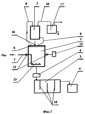 На фиг.1 показаны реактор 1, расширитель-холодильник 2, декантатор 3 с фильтром 4 и приемник продуктов утилизации 5. Реактор 1 снабжен герметически закрывающейся крышкой 6. Трубопровод 7 предназначен для подачи пара в реактор, трубопровод 8 предназначен для подачи пара, использованного в реакторе 1, в расширитель-холодильник 2, а трубопровод 9 – для отвода конденсата из расширителя-холодильника 2 в реактор 1. Для отвода газов, образующихся в системе “реактор-расширитель-холодильник”, предназначен трубопровод 10, соединенный с верхней частью расширителя-холодильника 2.