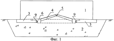 Фундамент резервуара 1 установлен на грунтовой подушке 2, на которую уложена опорная плита, состоящая из кольцевой плоской части 3 с толщиной, увеличивающейся к отверстию, и центральной части, выполненной в виде обращенного вверх вершиной конуса, который образован из секторов 4, соединенных шарнирно 5 в вершине и опирающихся на железобетонное кольцо 6, состоящее из элементов 7, соединенных гибкими вставками 8. Плоская кольцевая часть 3 имеет рессорные устройства 9, которые соприкасаются с железобетонным кольцом 6.