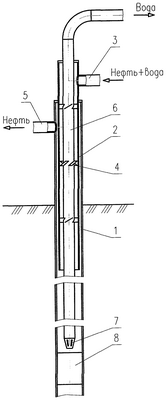 Недостатком устройства является невысокая степень очистки воды при разделении водонефтяной эмульсии в сепарационной камере, так как при тангенциальном вводе водонефтяной эмульсии эффект закручивания не поддерживается по всей кольцевой полости, образованной внутренней поверхностью сепарационной камеры и поверхностью трубопровода отвода воды. Недостатком является также то, что при разделении водонефтяной эмульсии используется ограниченное кольцевое пространство, в котором не обеспечиваются условия для окончательного разделения нефти и воды, а высокая скорость подъема воды в кольцевой полости при отводе воды по трубопроводу, присоединенному к устью скважины, не обеспечивает выпадение мехпримесей из воды.