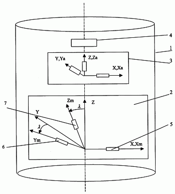 При этом триада 2 магнитометров установлена в корпусе 1 инклинометра так, что измерительная ось датчика 5 (с осью чувствительности Хm) перпендикулярна продольной оси корпуса 1, а оси магнитометров 6 и 7 (Zm,Ym) повернуты на некоторый угол относительно плоскости, образованной продольной осью корпуса Z и осью чувствительности датчика 5.